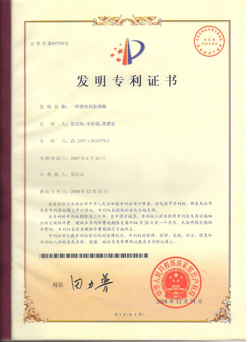 (双向自密封阀)(发明专利证书)专利号:ZL 2016 1 1232241.4