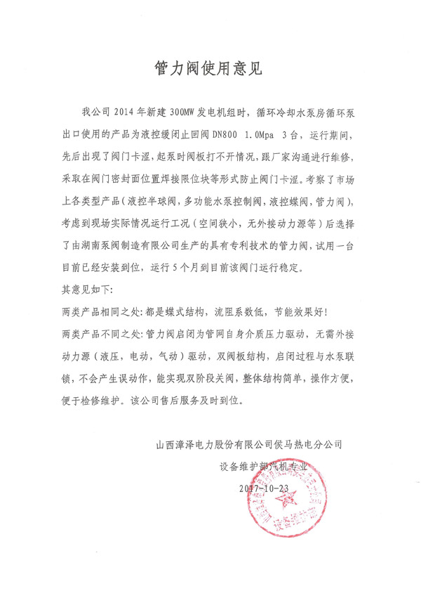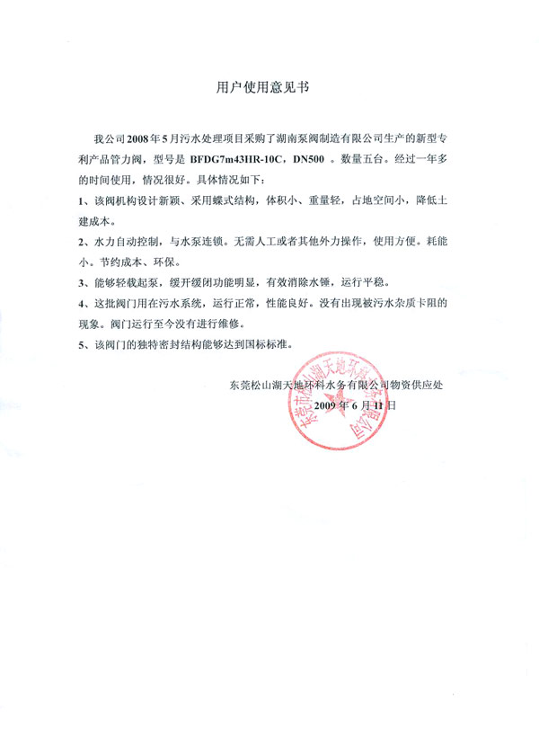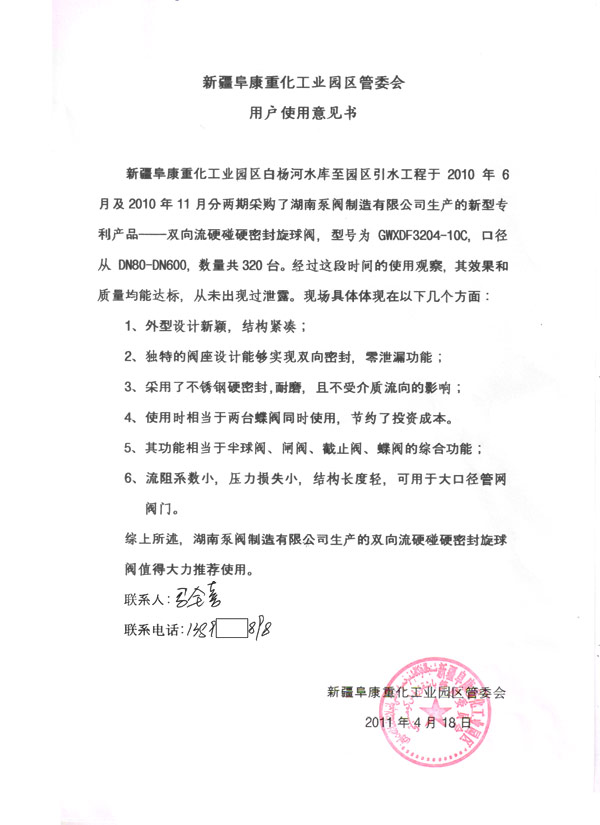 阜康工业园旋球阀用户使用意见书 东莞市松山湖天地环科税务公司管力阀 国电宝鸡第二发电有限公司用户意见